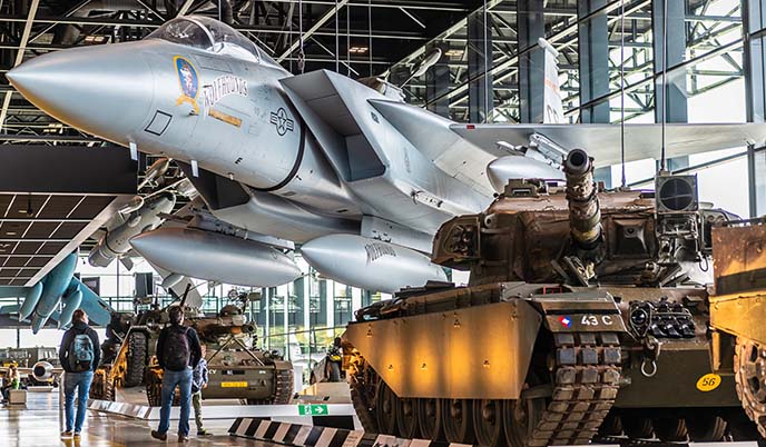 Het Nationaal Militair Museum in Soesterberg vertelt op een interactieve manier het verhaal van de Nederlandse krijgsmacht, van de middeleeuwen tot moderne F‑16’s.
